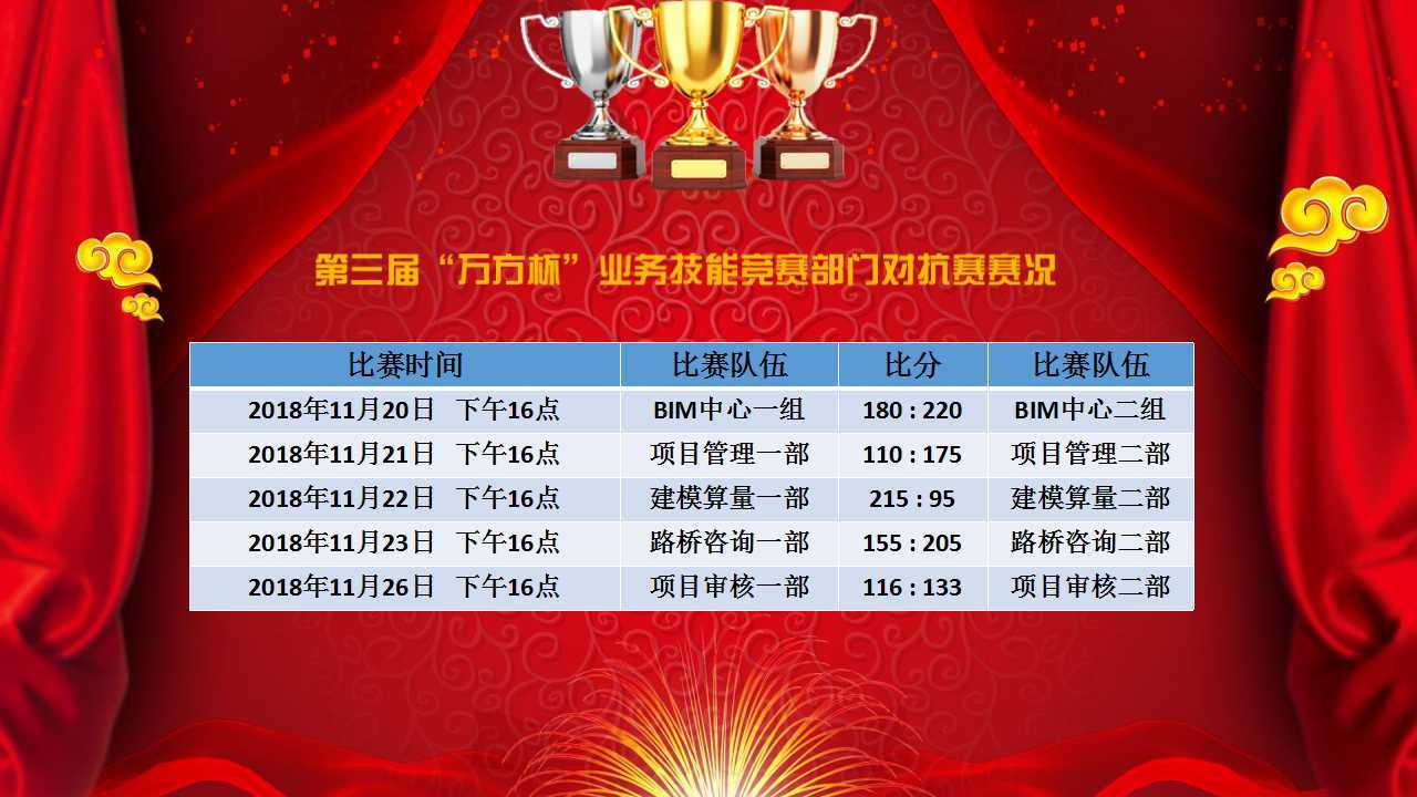 2018年11月20日,第三届“万方杯”业务技能竞赛如期拉开帷幕。延续了历届竞赛的模式,本届竞赛分部门对抗选拔赛、分组对抗循环赛两个阶段。竞赛由公司技术中心主办,综合运营部协办,项目审核一二部、项目管理一二部、建模算量一二部、路桥咨询一二部、BIM中心共九个业务部门为参赛部门。