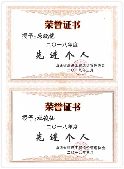 其中,我公司获省价协2018年度先进单位会员、连国柱等六名优秀造价工程师、原晓恺等两名先进个人,另有优秀造价成果一等奖五项、二等奖四项。