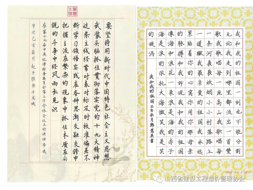 国庆前夕,山西省建设工程造价管理协会为庆祝中华人民共和国成立70周年,弘扬中华传统艺术魅力,丰富会员单位的文化生活,展示造价行业人员的风采,精心组织了全省造价行业“喜迎国庆、展我风采”的硬笔书法比赛。