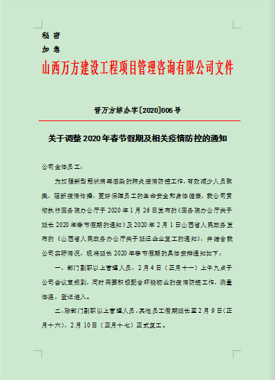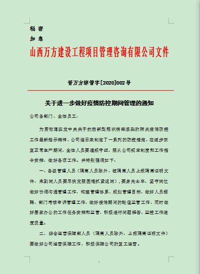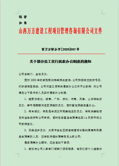 实行居家办公制度,要求疫情严重地区籍贯员工延期返岗,有疫情严重地区接触史的员工,依照居住地相关政策进行自我隔离,每日上报健康状况。已经返回太原无法到岗的员工,如有生活方面的困难,公司予以援助和解决,并调拨专用车辆进行配合。同时,依托万方青云企业管理平台进行线上办公,及时处理当紧任务。