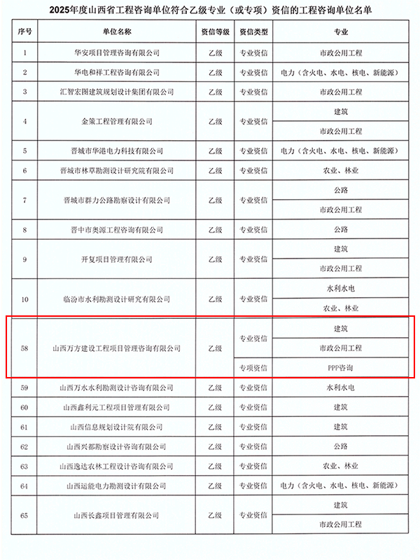 2025年8月20日,山西省工程咨询协会正式公布2024年持续符合及2025年符合乙级资信评价标准的工程咨询单位名单。我公司凭借深厚的专业积淀、规范的服务体系与过硬的综合实力,顺利通过建筑专业乙级资信、市政公用工程专业乙级资信及PPP专项乙级资信三项评价,这标志着公司在相关领域的技术能力与服务水平获得行业权威的高度认可。